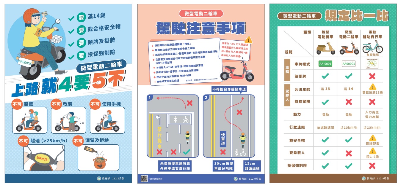 一、113年11月30日起騎乘微型電動二輪車需投保強制險及掛牌,且年滿14歲才能騎乘,「戴安全帽」、「不得載人或超速25km/hr」、「禁止飲酒後騎乘」、「不得擅自改裝」等。